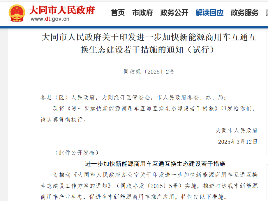 3月19日 (下午)三部門聯合升級貨車更新政策:交通運輸部、發改委、財政部將老舊貨車補貼范圍擴展至國三/國四排放車輛,取消燃料類型限制。根據新規,提前報廢并更換新能源貨車的企業最高可獲14萬元/車補貼,購置國六車型補貼7萬元。政策特別設置"綠色通道",對參與氫燃料電池車示范運營的企業額外給予3萬元運營補貼。支持資金按照總體9:1的原則實行央地共擔。 3月20日 湖北省確定汽車產業“雙百萬”目標 湖北省分別發布了《支持全省汽車產業發展若干措施(2024—2027年)》和《2025湖北省新能源汽車促消費政策》,將進一步助力2025年“湖北造”新能源汽車產量邁上100萬輛臺階的目標。 3月21日 大同構建新能源商用車生態圈 3月29日 央企重組開啟產業新格局 3月,財政部的扶持政策不僅延長了購置稅減免期限,還加大了對充換電基礎設施和智能網聯技術的投入,為新能源專用車的市場推廣和基礎設施建設提供了有力保障。此外,三部門聯合升級的貨車更新政策,提供了豐厚的補貼,將促進新能源專用車的銷售。湖北省確定汽車產業“雙百萬”目標不僅為當地提供了政策支持和市場需求保障,還促進了產業鏈的協同發展和新能源專用車的普及推廣。這一系列政策將有助于推動新能源專用車產業的快速發展和壯大。 |