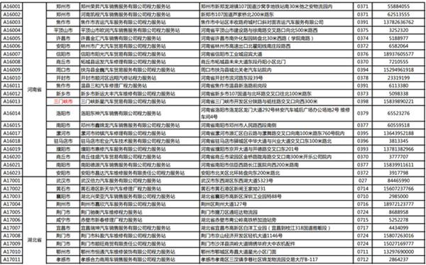 汽車河南省、湖北省服務站通訊錄: