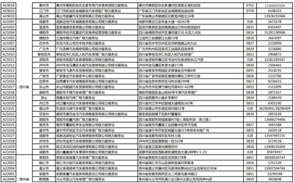 汽車廣東省、四川省、貴州省、服務站通訊錄: