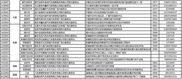 汽車內蒙省、寧夏省、新疆省、海南省、西藏服務站通訊錄: